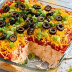 - Top with Olives and Green Onions: Scatter the sliced black olives and chopped green onions evenly over the cheese layer.