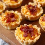 Sprinkle about a teaspoon of the chopped bacon pieces on top of each filled shell. Then, pop the tray in the preheated oven for 5-8 minutes—just until the cheese starts to get warm and the shells crisp up a bit more. Watch carefully so they don’t burn.