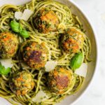 These Baked Chicken Pesto Meatballs are a healthy and flavorful dish combining lean ground chicken with fresh grated zucchini and carrot, enriched with basil pesto and parmesan cheese. They bake quickly to golden perfection and make a perfect main course or appetizer, served as is or with pasta and sauce.