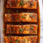 - Prepare Salmon for Baking: Place the salmon fillets skin side down in the prepared baking dish. Reserve half of the glaze in a clean dish for later use. Brush or spoon the remaining half of the glaze evenly over the top of each salmon fillet.