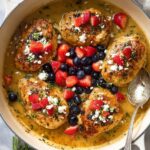 - Serve: Top the chicken with blueberries, diced strawberries, and crumbled feta cheese. Remove from heat and serve over or alongside fresh arugula with glazed pecans or almonds and additional berries.