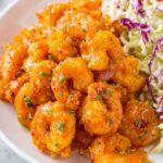 I love finishing my bang bang shrimp with a sprinkle of chopped green onions and a handful of fresh cilantro. It adds brightness and a fresh contrast to the creamy-spicy sauce. Sometimes a wedge of lime on the side is perfect too — a quick squeeze really lifts the flavors.