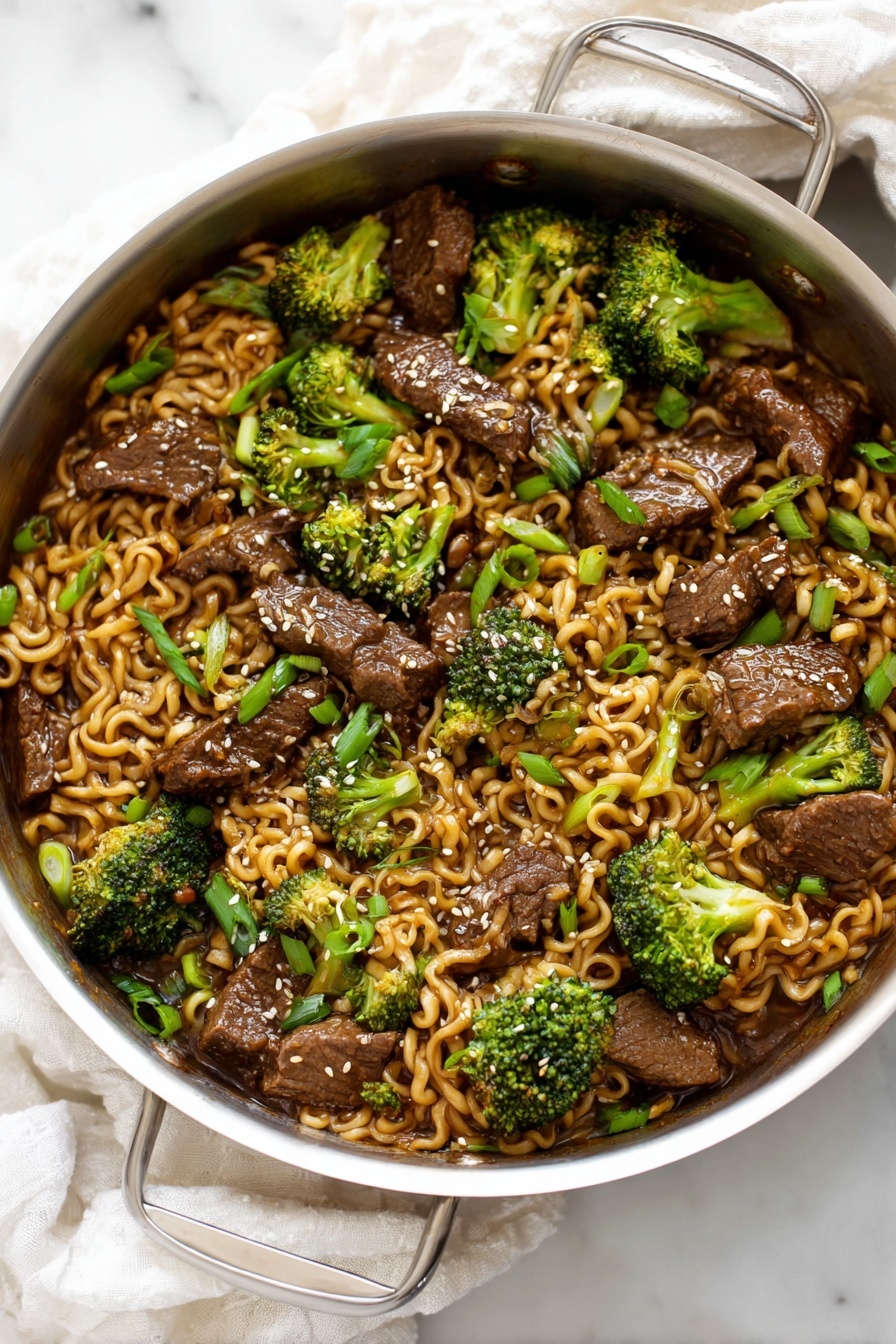 When I serve this beef and broccoli ramen stir fry, I always top it with a handful of chopped green onions for freshness and crunch. Roasted peanuts add a lovely nutty crunch and texture contrast, and toasted sesame seeds bring a subtle earthy aroma that just elevates the whole dish. If you like a little heat, a sprinkle of red pepper flakes is fantastic. I’ve also tossed on crunchy chow mein noodles a few times for extra texture, which was a big hit with guests!