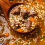 A hearty and comforting Beef Barley Soup featuring tender beef chuck, aromatic vegetables, and nutty pearled barley simmered to perfection in a rich beef broth with red wine and herbs.
