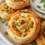Buffalo Chicken Pinwheels are savory, bite-sized appetizers featuring shredded chicken mixed with buffalo sauce, cream cheese, Greek yogurt, mozzarella, and spices wrapped in flaky puff pastry and baked to golden perfection. Perfect for parties and game day snacks.