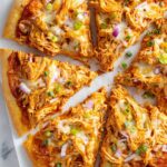 This Buffalo Chicken Pizza combines tender shredded chicken tossed in spicy buffalo sauce with melty mozzarella and tangy blue cheese dressing on a crispy, garlic Parmesan crust. Perfectly balanced with red onions and banana peppers, this pizza is a flavorful twist on classic buffalo wings, baked to golden perfection and garnished with fresh chives, red pepper flakes, and parsley.