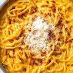 This creamy butternut squash pasta combines roasted butternut squash, caramelized onions, and roasted garlic blended into a smooth sauce, tossed with al dente pasta and topped with crispy pancetta and grated Parmesan. It is a comforting, flavorful dish perfect for fall or any cozy meal.