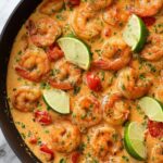 This Cajun Shrimp recipe features perfectly seasoned shrimp cooked with red bell peppers and served in a rich, creamy sauce made from garlic, butter, cream, cheese, and a blend of spices. The sauce incorporates diced tomatoes with green chilies and is finished with a splash of lime juice and fresh cilantro, making it a flavorful dish perfect for serving over rice, beans, or a fresh salad.