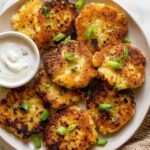 These crispy and flavorful cauliflower fritters are a delicious way to enjoy a healthy vegetable snack or appetizer. Made with tender steamed cauliflower, Parmesan cheese, and Italian breadcrumbs, they are pan-fried to golden perfection and garnished with fresh green onions. Perfect for a light meal or as an appetizer with your favorite dipping sauce.