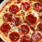 This creamy and cheesy pizza dip is the perfect appetizer for pizza lovers, combining cream cheese, sour cream, marinara sauce, and plenty of mozzarella and Parmesan cheeses with classic pizza toppings like pepperoni. Baked until bubbly and golden, it’s deliciously served warm with crusty bread or chips for dipping.