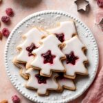 Cherry Almond Linzer Cookies are delicate sandwich cookies featuring a buttery almond-flavored dough filled with sweet cherry preserves and topped with a light almond-flavored glaze. Perfect for festive occasions or a delightful treat with tea or coffee.