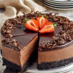 A rich and creamy chocolate cheesecake with a chocolate cookie crust, smooth chocolate-infused filling, and a glossy ganache topping. Perfect for special occasions or indulgent desserts.