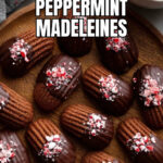 These Chocolate Peppermint Madeleines are delicate French butter cakes with a rich cocoa flavor, infused with peppermint extract for a festive twist. They are coated with melted bittersweet chocolate and topped with crushed candy canes, perfect for holiday treats or elegant dessert occasions.