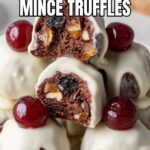 These Christmas Fruit Mince Truffles are rich and festive treats combining dark chocolate, creamy texture, and flavorful fruit mince. Coated in milk and white chocolate with a cherry on top, they are perfect for holiday celebrations or gifting.