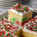 - Decorate and Serve: Before serving, sprinkle red and green decorations over the cake for a festive touch. Slice and enjoy your colorful Christmas poke cake.