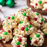 These festive Christmas Popcorn Balls are a fun and colorful holiday treat made with buttery popcorn, melted marshmallows, and decorated with red and green M&M candies along with festive sprinkles. Perfect for holiday parties or gifting.
