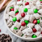 Christmas Puppy Chow is a festive, sweet snack mix featuring rice cereal coated in creamy melted chocolate, peanut butter, and butter, dusted with confectioners sugar and sprinkled with colorful holiday M&M's. This crunchy, chocolaty treat is perfect for holiday parties or a cozy snack during the winter season.