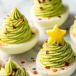 Celebrate the holidays with festive Christmas Tree Deviled Eggs, a creative and delicious appetizer featuring creamy avocado-infused filling and vibrant bell pepper stars for garnish.