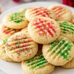 - Create Pattern and Add Sugar: Lightly press a criss-cross pattern onto each cookie ball using a fork. Sprinkle red and green sanding sugar over the tops for a festive look.