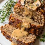 A classic, hearty meatloaf recipe made with ground chuck and seasoned breadcrumbs, served with a rich brown mushroom gravy. This comforting dish is perfect for a satisfying dinner and features fresh herbs and a flavorful pan gravy.