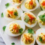 - Garnish and serve: Sprinkle the deviled eggs with finely grated carrots and thinly sliced green onions for a colorful finish. Serve immediately, or cover and refrigerate until ready to serve.