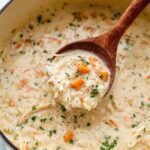 Crack Chicken and Rice Soup is a cozy, one-pot meal featuring tender shredded chicken, hearty rice, creamy cheese, and flavorful ranch seasoning. This comforting soup combines onions, celery, carrots, garlic, chicken broth, and smoky bacon, all simmered together to create a rich, cheesy dish perfect for chilly days or easy family dinners.