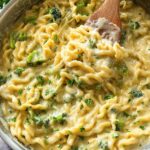 A creamy and cheesy pasta dish featuring finely chopped broccoli and sharp cheddar cheese, combined with a flavorful sauce made from chicken broth, half and half, and subtle seasonings. This recipe is quick to prepare and perfect for a comforting weeknight meal.