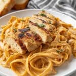 For special occasions, I like to plate the pasta in shallow bowls to showcase the creamy sauce and artfully fan the sliced chicken on top. Adding a lemon wedge on the side adds a bright visual pop and lets guests add a dash of citrus if they want.