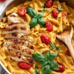 A creamy, flavorful Caprese Pasta recipe featuring tender seared chicken breast, a rich tomato cream sauce with garlic and white wine, and classic Italian flavors from fresh basil, cherry tomatoes, mozzarella, and Parmesan cheese. Perfect for a satisfying and elegant dinner that comes together in under an hour.