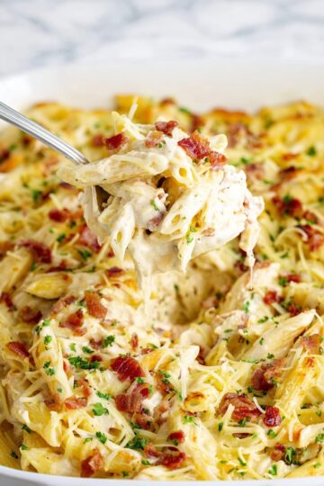 Before you get started, grabbing a rotisserie chicken will drastically cut down your prep time while giving you juicy, flavorful meat. Make sure to cook your bacon until it’s extra crispy—that added crunch is a game changer in this creamy pasta bake.