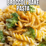 A comforting and flavorful chicken and broccoli pasta bake featuring tender chicken, sautéed in a savory white wine sauce with a creamy cheese mixture, fusilli pasta, and broccoli florets, all baked to perfection with crispy fried onions on top.
