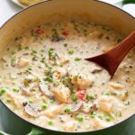 - Add Liquids and Simmer: Reduce the heat to medium-low. Gradually add the half and half mixture from step 1 in small splashes while stirring continuously, scraping up any browned bits from the pot’s bottom. Then add the chicken bouillon cube. Increase the heat to medium-high and bring the sauce to a boil. Reduce heat to a simmer, add the cut chicken pieces back to the pot, and simmer uncovered for 10 minutes to finish cooking the chicken.