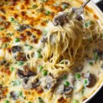 Chicken Tetrazzini is a creamy and comforting baked pasta casserole featuring tender chicken, mushrooms, peas, and a rich sauce made from cream soups, sour cream, and Parmesan cheese. This dish is baked to bubbly, golden perfection and garnished with fresh parsley for a satisfying family meal.