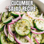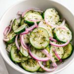 A refreshing and creamy cucumber salad featuring thinly sliced English cucumbers and red onions tossed in a tangy apple cider vinegar and olive oil dressing with a hint of honey, garlic, and fresh dill. Perfect as a chilled side dish to brighten up any meal.