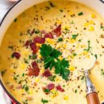 This Potato Corn Chowder is a rich and creamy soup featuring crispy bacon, tender potatoes, sweet corn, and aromatic herbs. Perfectly thickened with flour and finished with a touch of heavy cream, it's a comforting dish ideal for a cozy meal any time of the year.