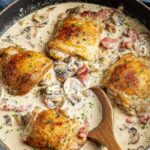 - Simmer the chicken: Return the chicken thighs and cooked bacon to the pan. Reduce the heat to low, cover the pan, and simmer for 25 to 30 minutes until the chicken is tender and the sauce thickens.