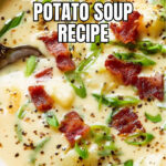 This creamy potato soup recipe is a comforting and hearty dish featuring Yukon gold potatoes simmered with vegetables, infused with savory bacon flavor, and finished with cream cheese for extra richness. Perfect for a cozy meal, it offers a smooth texture and can be customized with toppings like cheese and green onions.