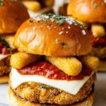 These Chicken Parmesan Sliders feature tender breaded chicken breasts topped with marinara, provolone cheese, and melted mozzarella sticks, all nestled in buttery slider buns for a delightful handheld meal perfect for parties or family dinners.