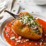 This classic Chile Relleno recipe features roasted poblano peppers stuffed with melted Monterey Jack cheese, coated in a fluffy egg batter, and fried to a crispy golden perfection. Served with a flavorful salsa roja made from fresh tomatoes, onions, garlic, and jalapeño, this dish delivers a delicious balance of smoky, cheesy, and tangy flavors, perfect for a satisfying meal.