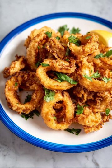 Fresh lemon wedges are the classic garnish for crispy fried calamari – a squeeze of lemon juice brightens every bite! You can also add a sprinkle of freshly chopped parsley or a light dusting of flaky sea salt for an extra pop of flavor and color.