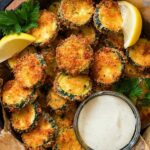 Crispy fried zucchini crisps coated in seasoned flour, egg wash, and crunchy panko breadcrumbs, served with a flavorful garlic aioli dipping sauce. Perfect as a savory appetizer for gatherings or a delicious snack.