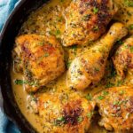 Southern Smothered Chicken features tender fried chicken thighs and drumsticks simmered in a rich, creamy gravy made with seasoned flour, sautéed onions, chicken broth, and milk. This classic Southern skillet recipe delivers comforting flavors that are perfect for chilly days.