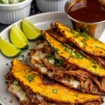 - Assemble and Cook Tacos: Heat olive oil in a large skillet over medium heat. Dip corn tortillas into the reserved consommé briefly, then place 2-3 tortillas flat in the skillet. Evenly distribute Oaxaca cheese over the tortillas, then add shredded beef, diced onions, and minced cilantro to one half of each tortilla. Fold the tortillas in half and cook for 2-3 minutes on each side until the cheese melts and the tortillas get crispy.