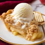 - Tenting the pie with foil towards the end of baking prevents the crumb topping from burning while allowing the apples to cook fully.
