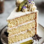 - Assemble the cake: If necessary, level the cooled cakes with a serrated knife to ensure flat layers. Stack the cakes with a generous amount of frosting between each layer, then frost the top and sides evenly. Decorate the cake with crushed dill pickle potato chips, candied pickle slices, and fresh dill sprigs as desired for added texture and presentation.
