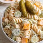 A zesty and creamy dill pickle pasta salad featuring rotini pasta, sharp cheddar, and a tangy dill-infused dressing, perfect for picnics and potlucks.