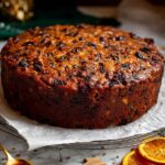 A traditional rich and moist Christmas cake packed with mixed dried fruits, nuts, and warm spices, soaked in cherry brandy and baked to perfection. This festive cake improves with time as it is fed with brandy weekly, developing deeper flavors for a perfect holiday dessert.