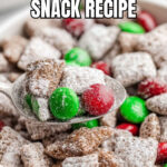 A festive and delicious sweet snack mix combining crunchy Chex cereal coated in a smooth chocolate and peanut butter mixture, dusted with powdered sugar, and mixed with colorful mini peanut butter cups and red and green M&M’s. Perfect for holiday celebrations or gifting as 'Reindeer Food.'