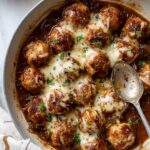 Delicious French Onion Chicken Meatballs feature tender ground chicken combined with Gruyère and herbs, baked to perfection and served with a rich, caramelized onion and thyme sauce topped with melted Gruyère cheese for a comforting and flavorful meal.