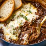 This French Onion Pot Roast recipe features a tender, slow-braised chuck roast cooked with rich caramelized yellow onions, garlic, white wine, and fresh herbs. Melted Gruyere cheese tops the savory roast, adding a creamy finish perfect for serving over mashed potatoes or toasted baguette slices.